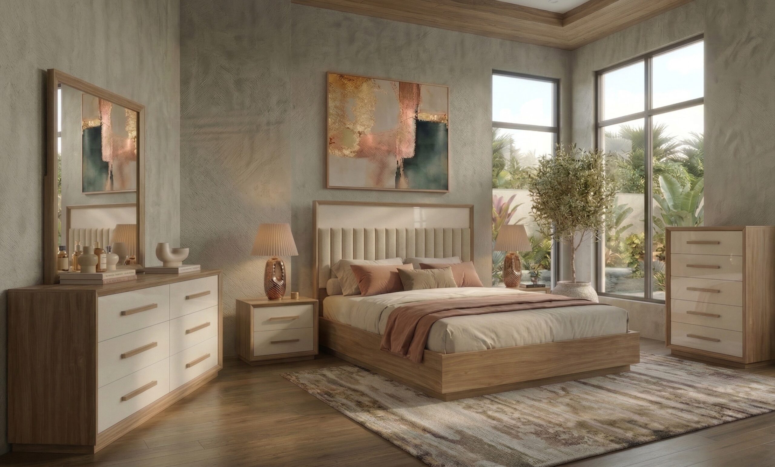 The Amaris Collection masterfully blends mid-century warmth with contemporary elegance, centering on a platform bed with a plush, vertical-channeled upholstered headboard. Framed in honey-toned wood, this dual-material design creates a striking visual contrast, offering both structural clean lines and a soft, inviting texture for a sophisticated retreat.